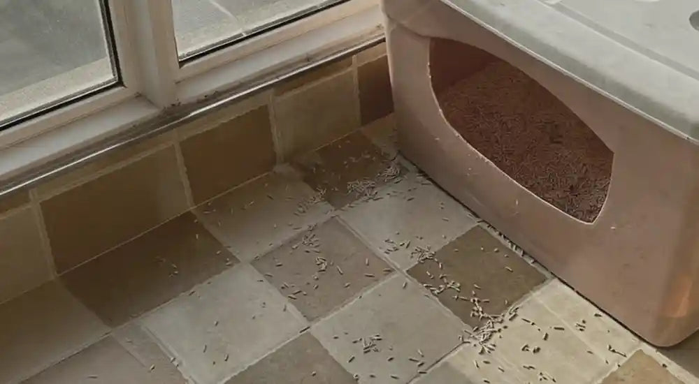 Loose litter spreads around the box and onto the floor.