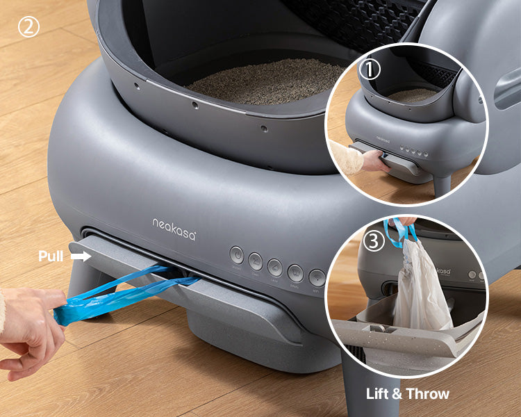 The Neakasa M1 cat litter box features a "Pull and Wrap" Waste Management System, ensuring a seamless, odor-free and contactless litter disposal process. A quick pull securely wraps the trash bag, without any mess or unpleasant smells.
