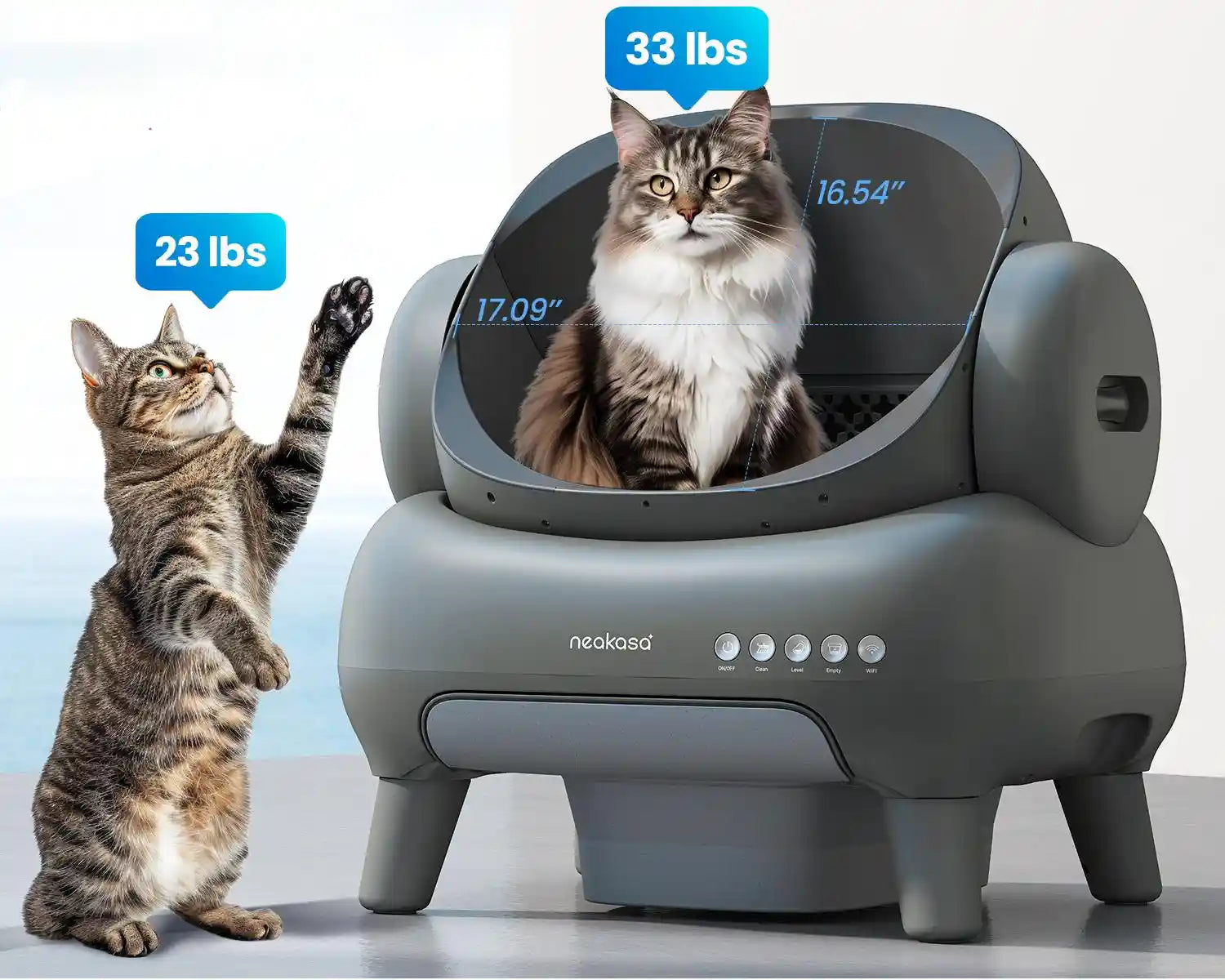 Neakasa M1 features open-top spacious design, it almost does not have a weight limit. But we recommend it for cats weighing 2.2-33 lbs for the best comfort. If your kitty is less than 2.2 lbs, we suggest choose our special Kitten Mode to prevents automatic cleaning and ensure kitty safe.