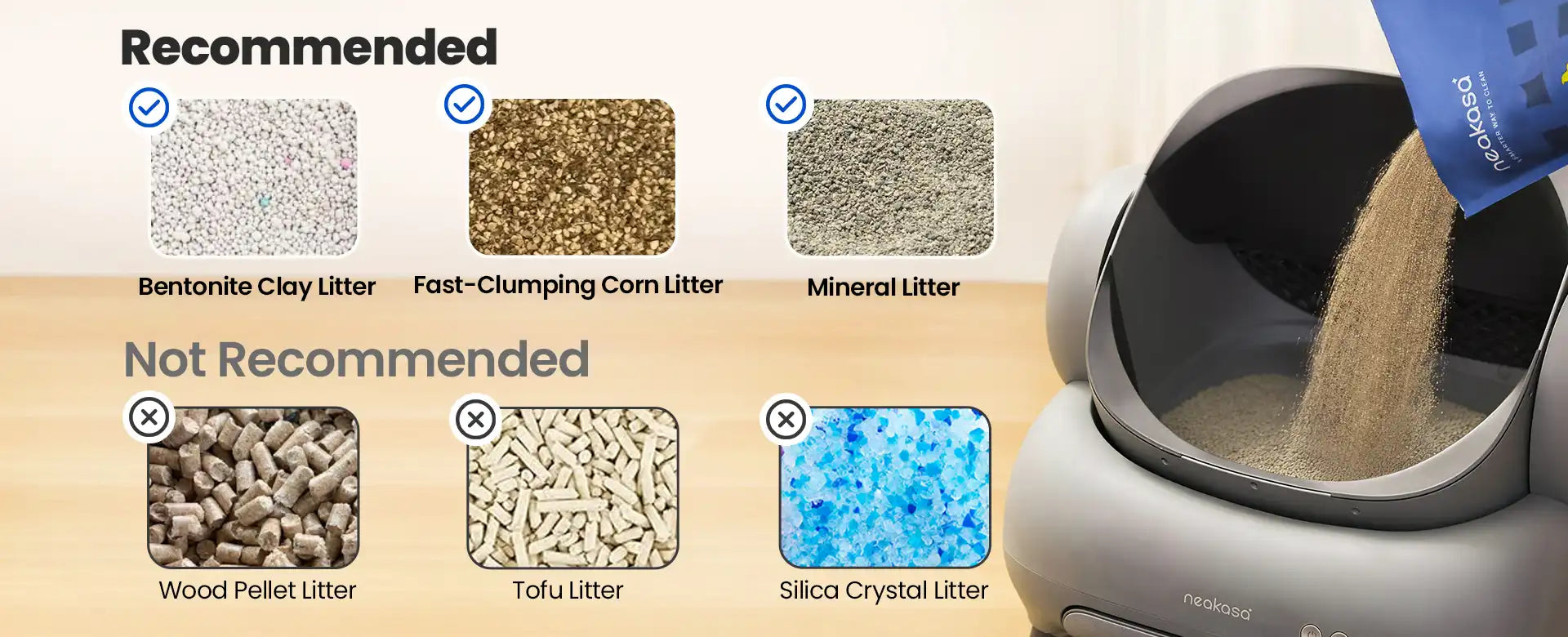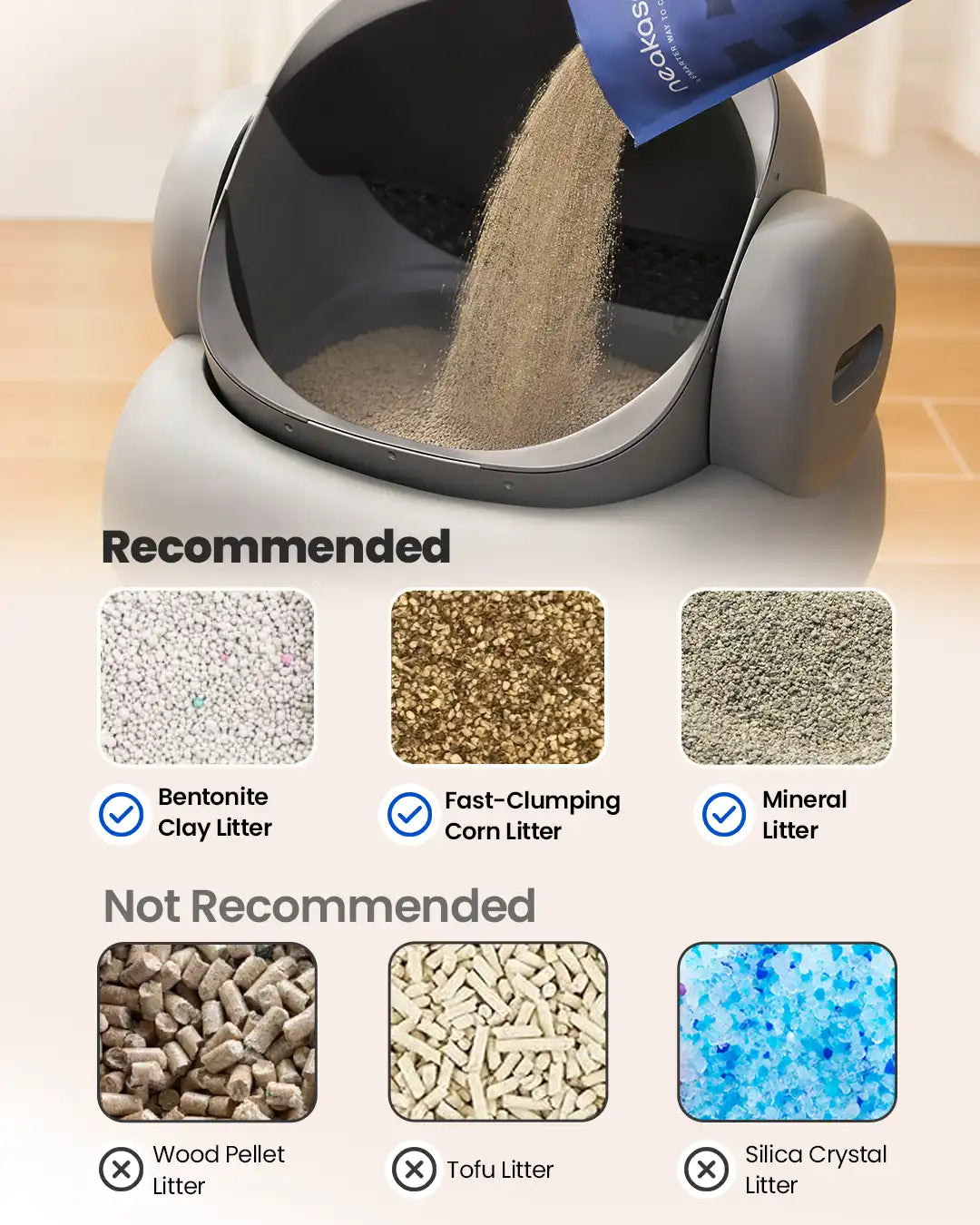 The M1 automatic cat litter box is compatible with clumping or scoopable litter, but not with highly absorbent, non-clumping, loosely clumping, newspaper, or wood pellet types.