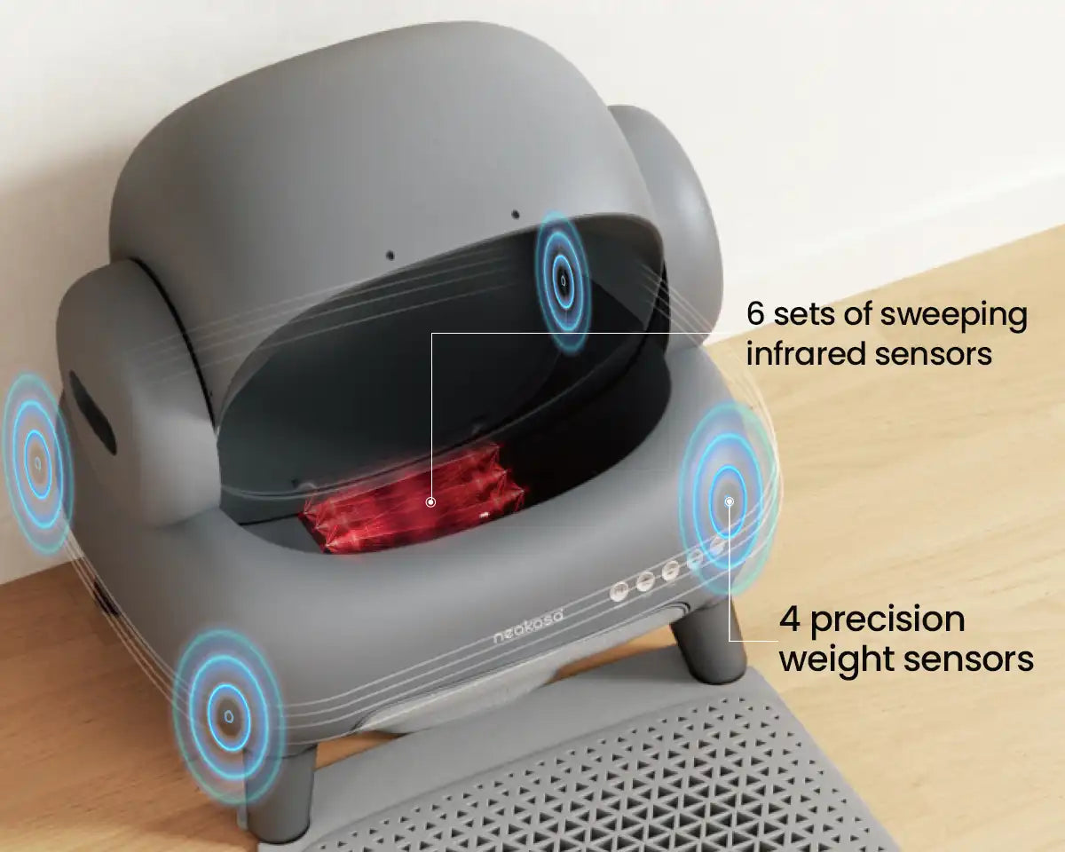 To ensure your cat's safety, there are 6 pairs of swiping infrared sensors and 4 weight sensors inside the Neakasa M1.