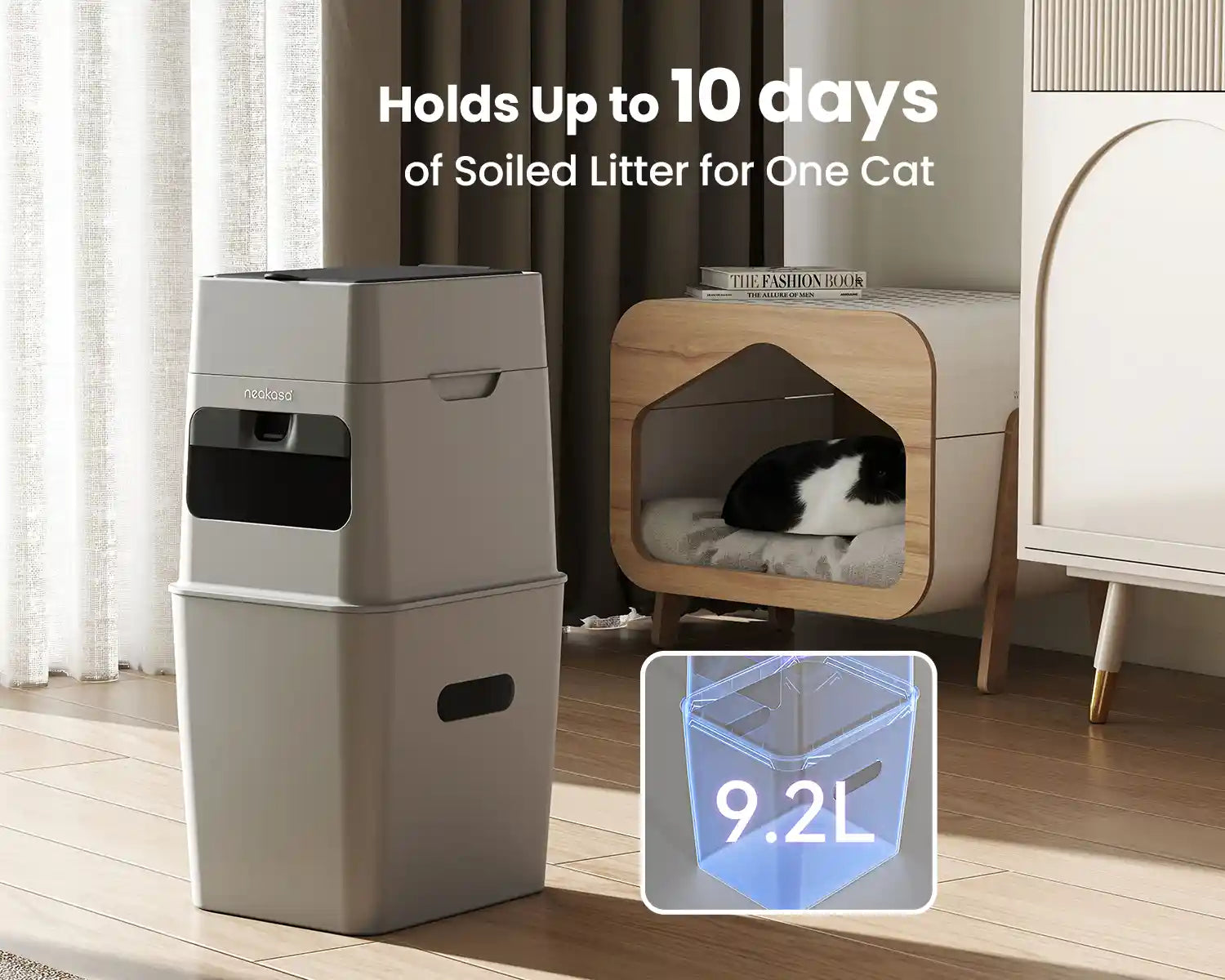 Large 9.2L capacity holds up to 10 days of used litter for one cat. Fewer trash runs, easier pet care.